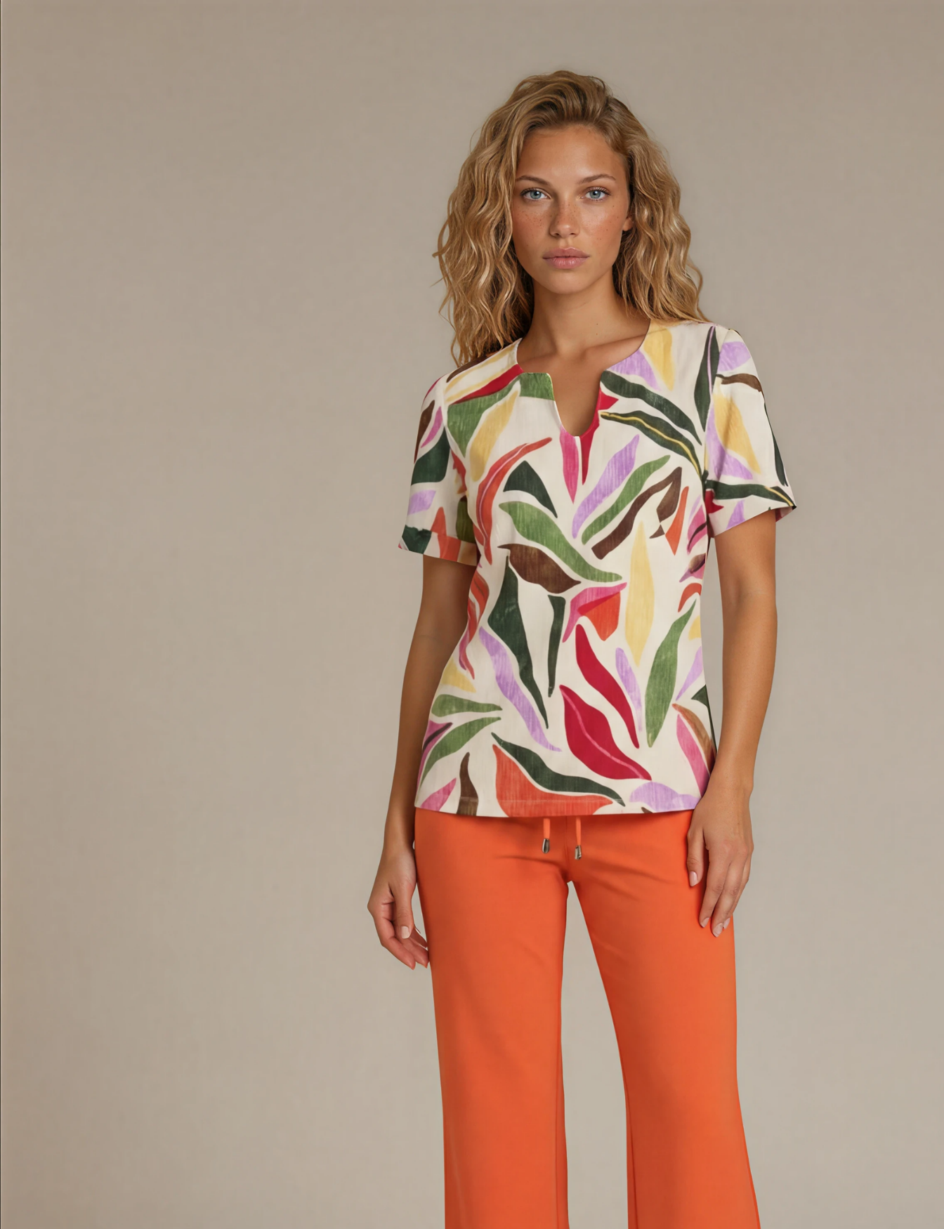 Mi Piace – Top Caftan Neck Summer Leaf Dance Print – Off White