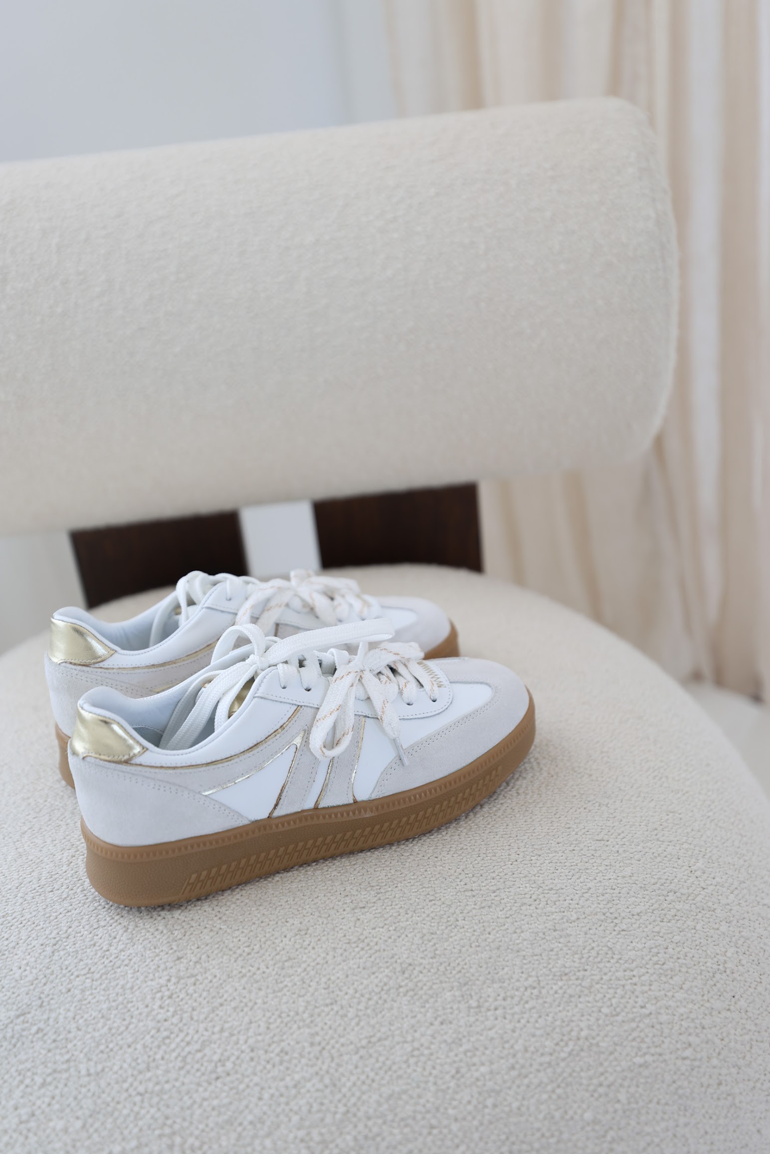 De combinatie van wit en goud geeft de sneaker een frisse en luxe uitstraling. De subtiele gouden details zorgen voor een elegante touch, terwijl het sportieve ontwerp de schoen perfect maakt voor casual outfits.