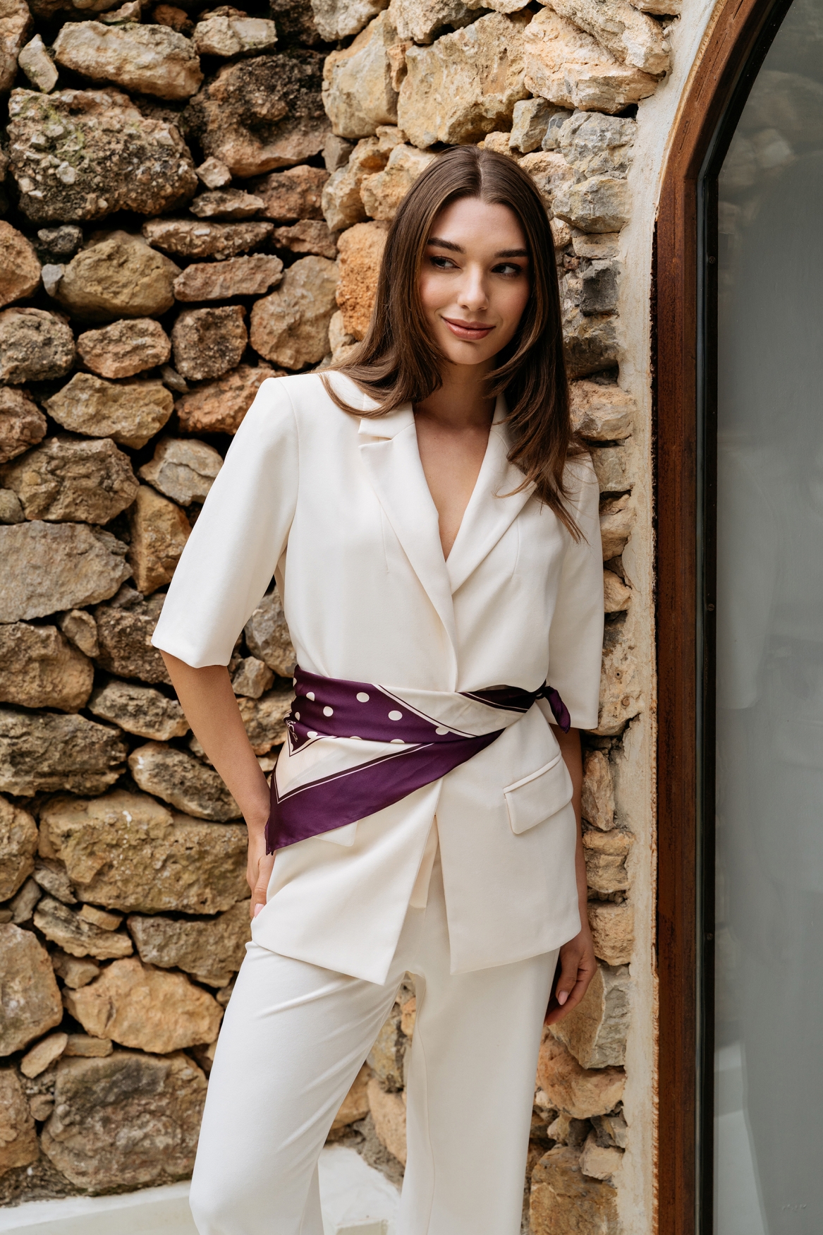 Combineer de Dot Scarf met een blazer, blouse of jurk voor een complete en verzorgde uitstraling. Een veelzijdig accessoire dat niet mag ontbreken in je garderobe.