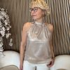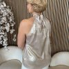 Ontdek de elegante Vivian Top, gemaakt van glanzende stof. Deze mouwloze top heeft een hoge hals en een losse pasvorm, wat zorgt voor een moderne en verfijnde uitstraling. De achterkant van de top heeft een halterstijl met een strik bij de nek, wat een extra vleugje elegantie toevoegt. De glanzende stof biedt een vleugje glamour, perfect voor zowel casual als feestelijke gelegenheden. De Vivian Top is verkrijgbaar in de kleuren Sky Blue en Sand. Combineer deze top met een van onze stijlvolle broeken of rokken voor een complete en modieuze look.