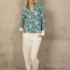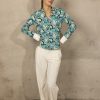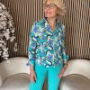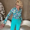 Maak kennis met de Yen Blouse, een opvallend kledingstuk gemaakt van hoogwaardige travelstof met de levendige Disco Fever print. Deze blouse heeft een kleurrijk, wervelend patroon in tinten blauw, groen en zwart, wat zorgt voor een moderne en stijlvolle uitstraling. De manchetten zijn nu ook in de Disco Fever print, wat zorgt voor een samenhangend en modieus geheel. Perfect voor zowel casual als formele gelegenheden.