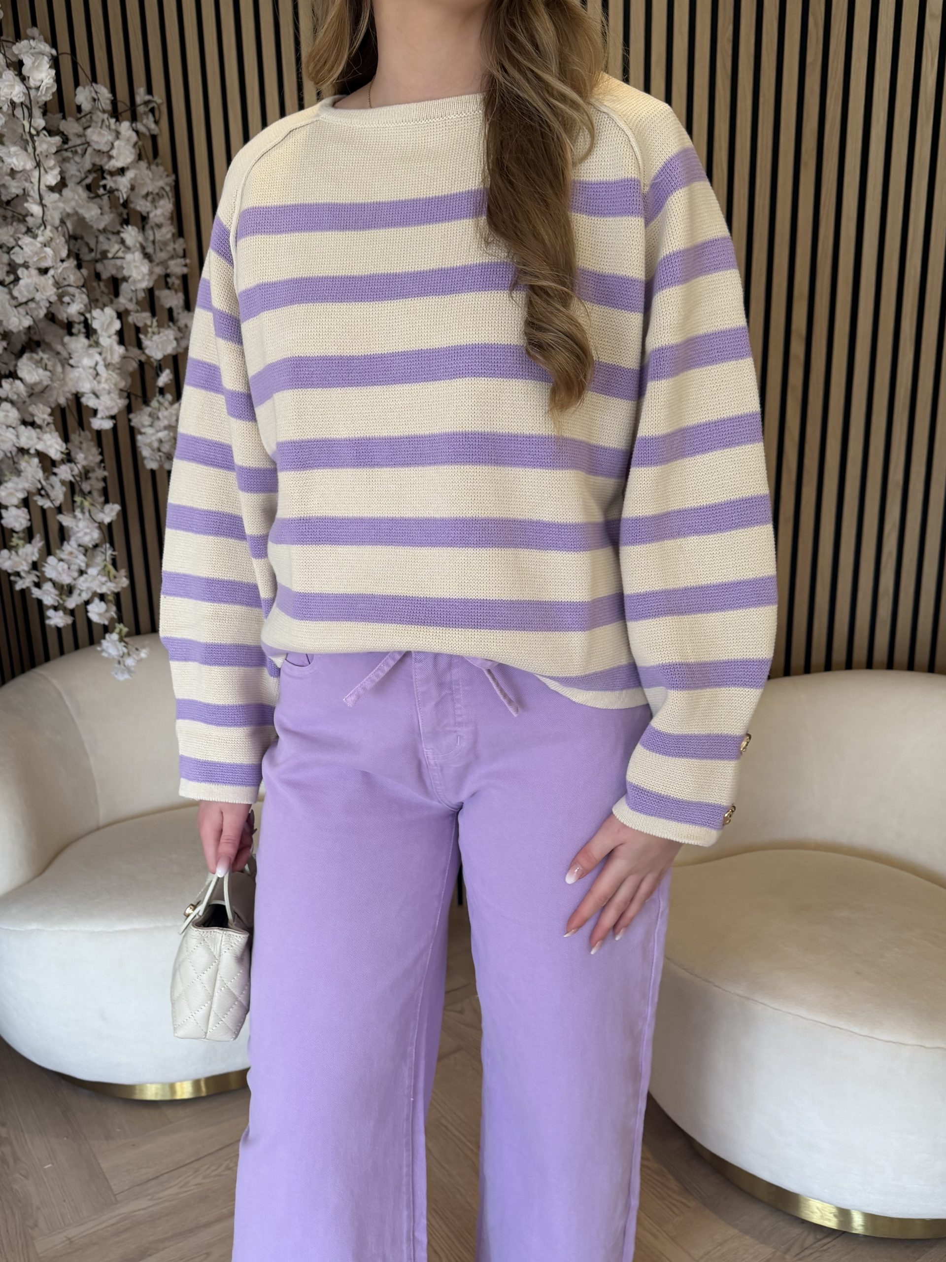 Het tijdloze streeppatroon in cream en violet geeft je outfit direct een speelse en stijlvolle uitstraling. De fijne knit en subtiele details zorgen voor een elegante afwerking die je zowel casual als gekleed kunt dragen. Combineer de Breton Sweater moeiteloos met een travelstof broek van Lady Day voor een stijlvolle mix, of draag hem op een jeans voor een relaxte maar verzorgde look. Dit is zo’n sweater die je pakt voor werk, een lunchafspraak of een dag waarop je er moeiteloos goed uit wilt zien, zonder na te denken.
