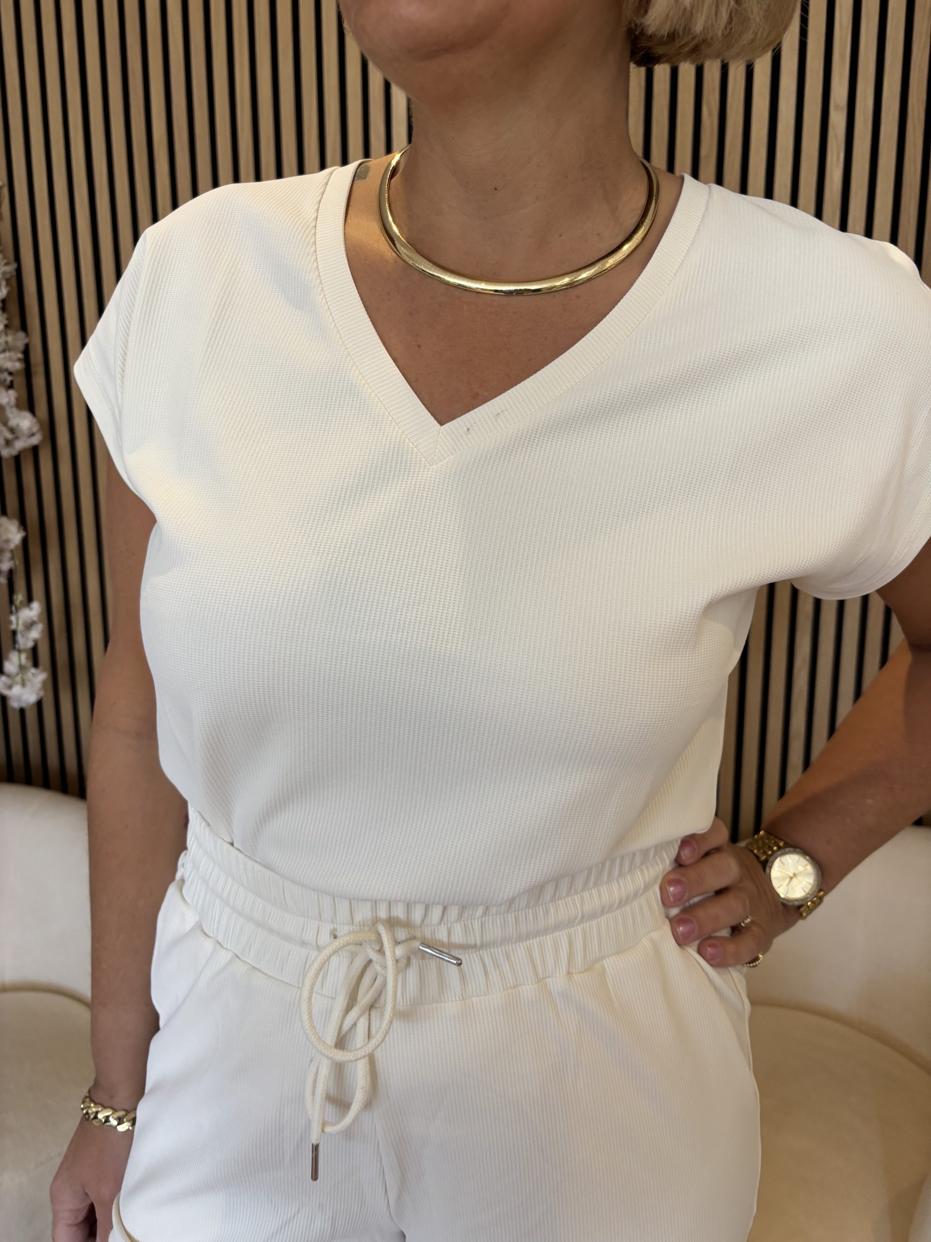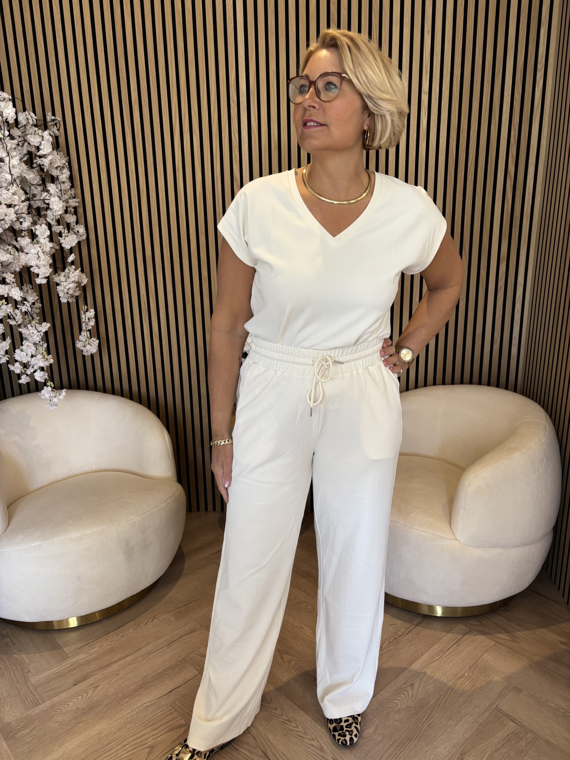 De top is gemaakt van comfortabele travelstof, wat zorgt voor optimaal draaggemak. De stof is lichtgewicht, ademend en kreukvrij, waardoor je de hele dag geniet van een verzorgde look zonder moeite. Dankzij de pasvorm die mooi op maat valt, sluit de top elegant aan en creëert het een vrouwelijk silhouet.