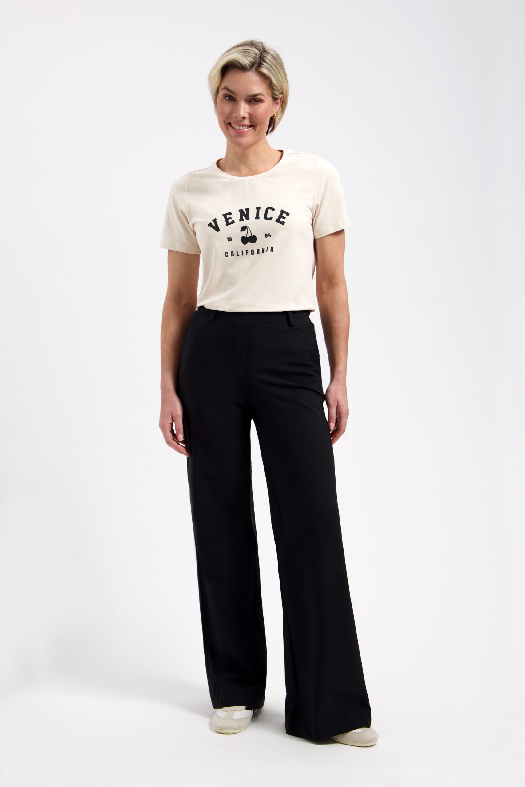 De Venice California print met kers detail geeft je outfit direct een speelse en moderne uitstraling. Combineer de Cherry Tops moeiteloos met een travelstof broek van Lady Day voor een stijlvolle casual look, of draag hem op een jeans met sneakers voor een relaxte everyday outfit. Dit is zo’n T-shirt dat je pakt wanneer je er moeiteloos verzorgd uit wilt zien.