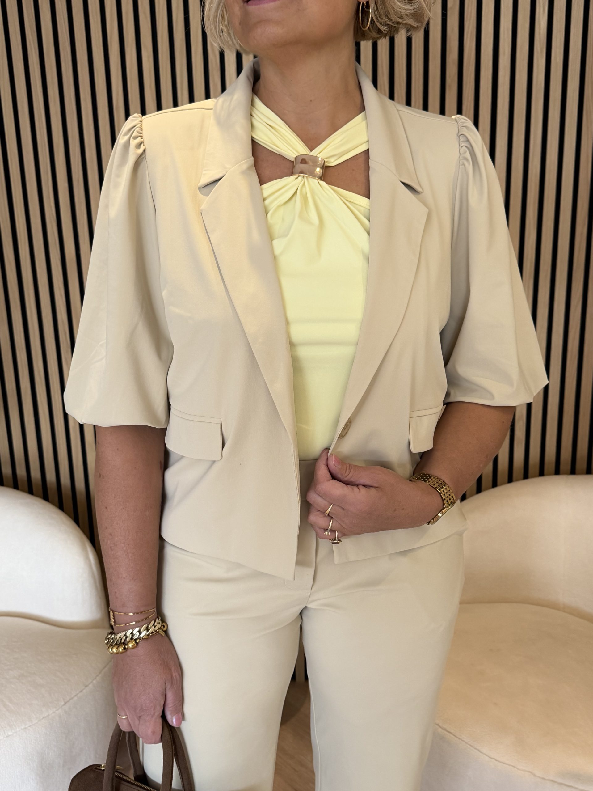 De top is gemaakt van comfortabele travelstof, wat zorgt voor een fijne stretch en een pasvorm die mooi aansluit op het lichaam. Dankzij de ademende en kreukvrije eigenschappen blijft de top de hele dag mooi in model en voelt hij heerlijk comfortabel aan, ongeacht de gelegenheid.