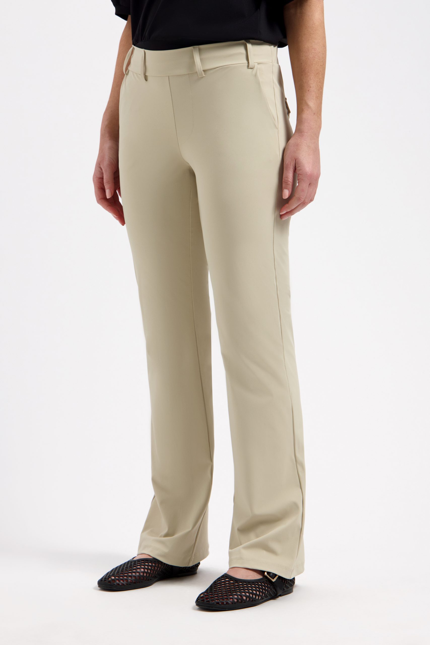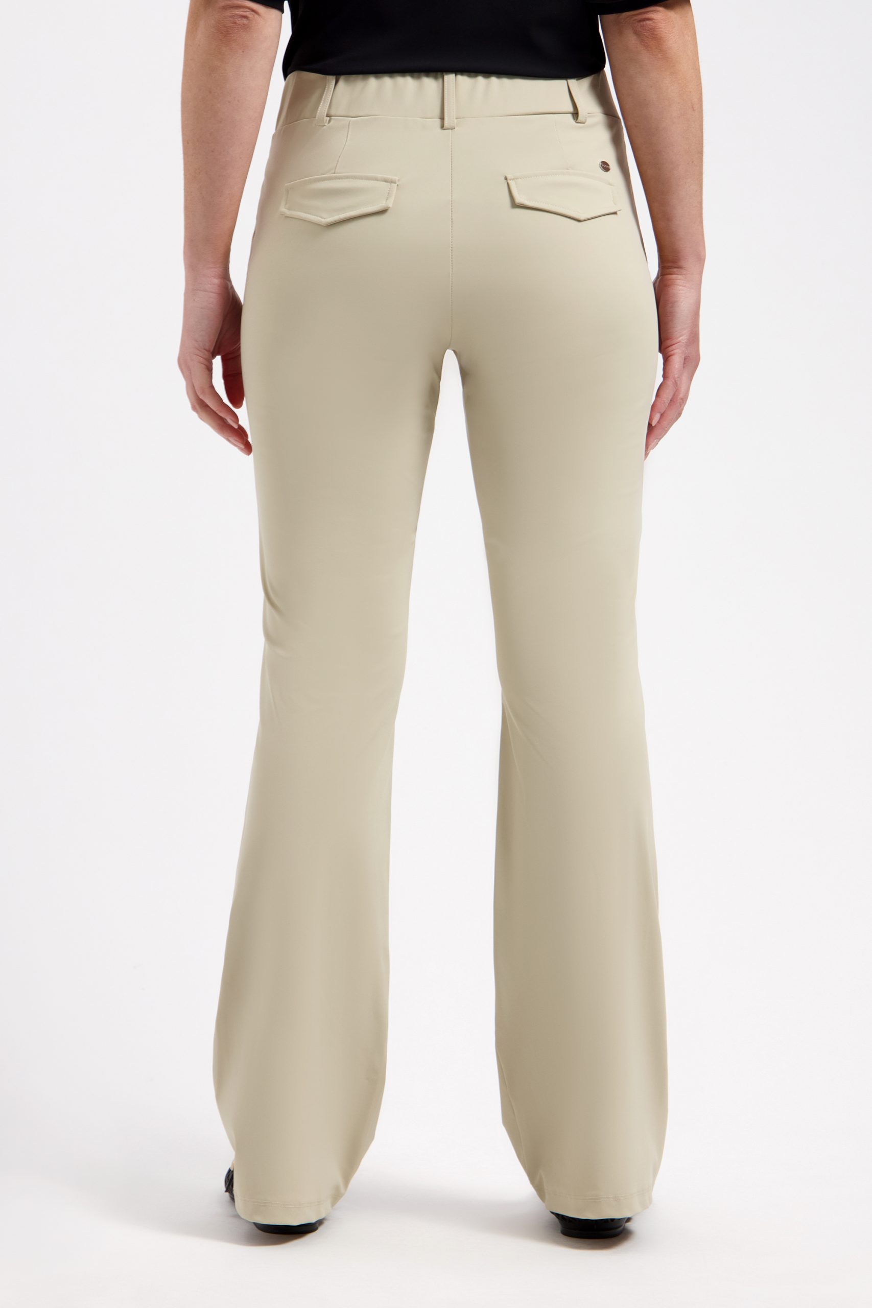 De flared pasvorm met licht uitlopende pijpen creëert een mooi silhouet en laat je benen optisch langer lijken. Dankzij de hoogwaardige travelstof voelt de broek licht en soepel aan, terwijl hij de hele dag perfect in model blijft zonder te kreuken. Ideaal voor drukke dagen waarop je er verzorgd uit wilt zien zonder in te leveren op comfort.
