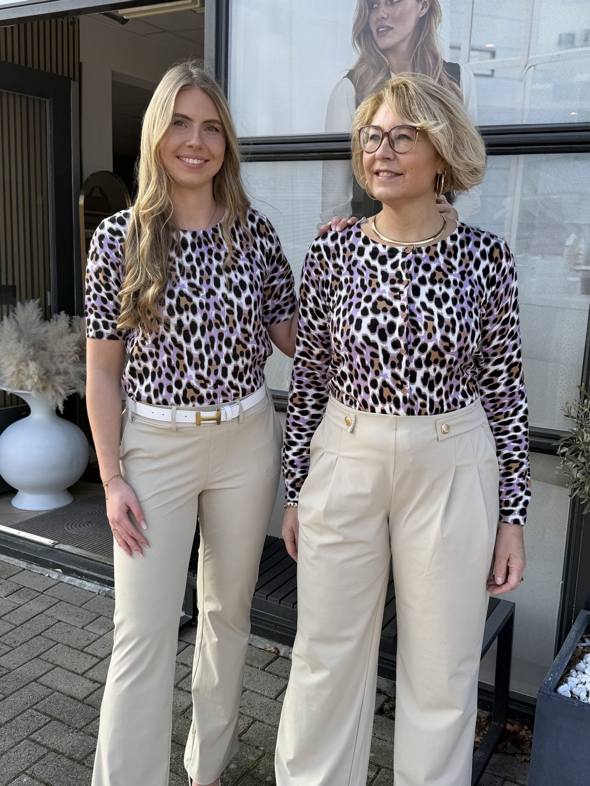 De opvallende Sutton print in paarstinten geeft je outfit direct een krachtige en eigentijdse uitstraling. De korte mouwen en de fijne knitkwaliteit zorgen voor een luchtige, stijlvolle look die je het hele seizoen kunt dragen. Combineer de Sage Sweater moeiteloos met een travelstof broek van Lady Day voor een stijlvolle set, of draag hem casual op een jeans. Dit is zo’n sweater die je pakt voor werk, een afspraak of een dag waarop je outfit net dat beetje extra mag hebben, zonder na te denken.