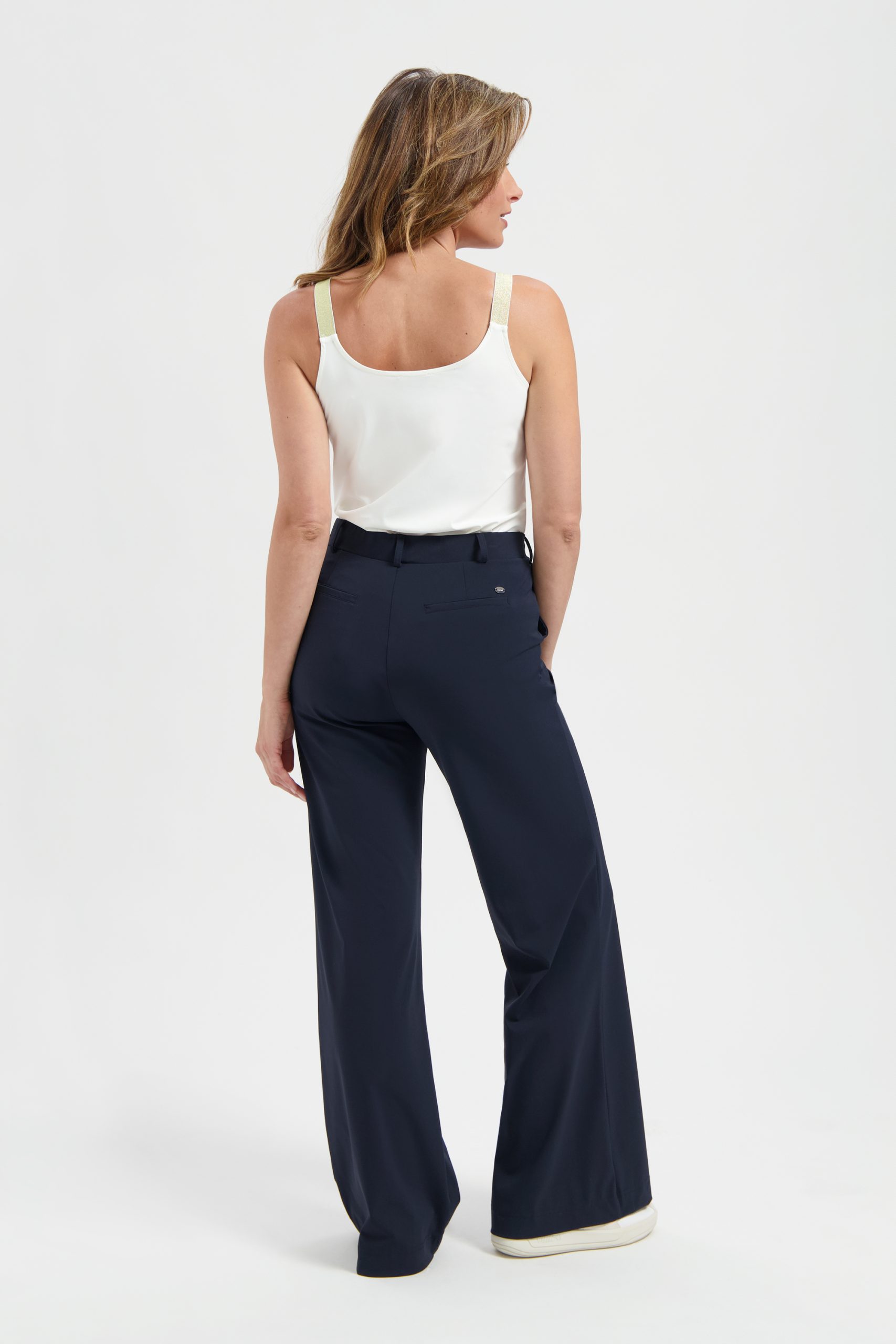 De comfortabele travelstof voelt licht aan op de huid en biedt een fijne stretch, waardoor de top mooi in model blijft en de hele dag prettig draagt. Dankzij de ademende en kreukvrije eigenschappen zie je er altijd verzorgd uit, zonder moeite. De subtiele glitterdetails op de schouderbanden geven de top een luxe en verfijnde touch.