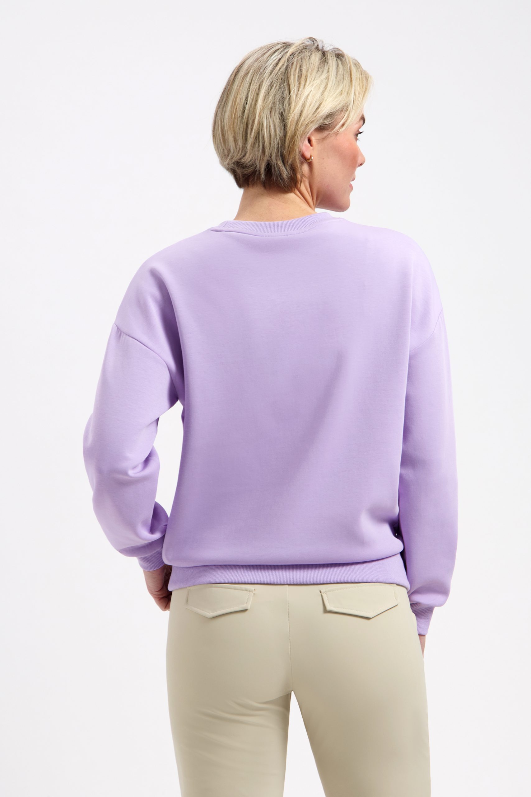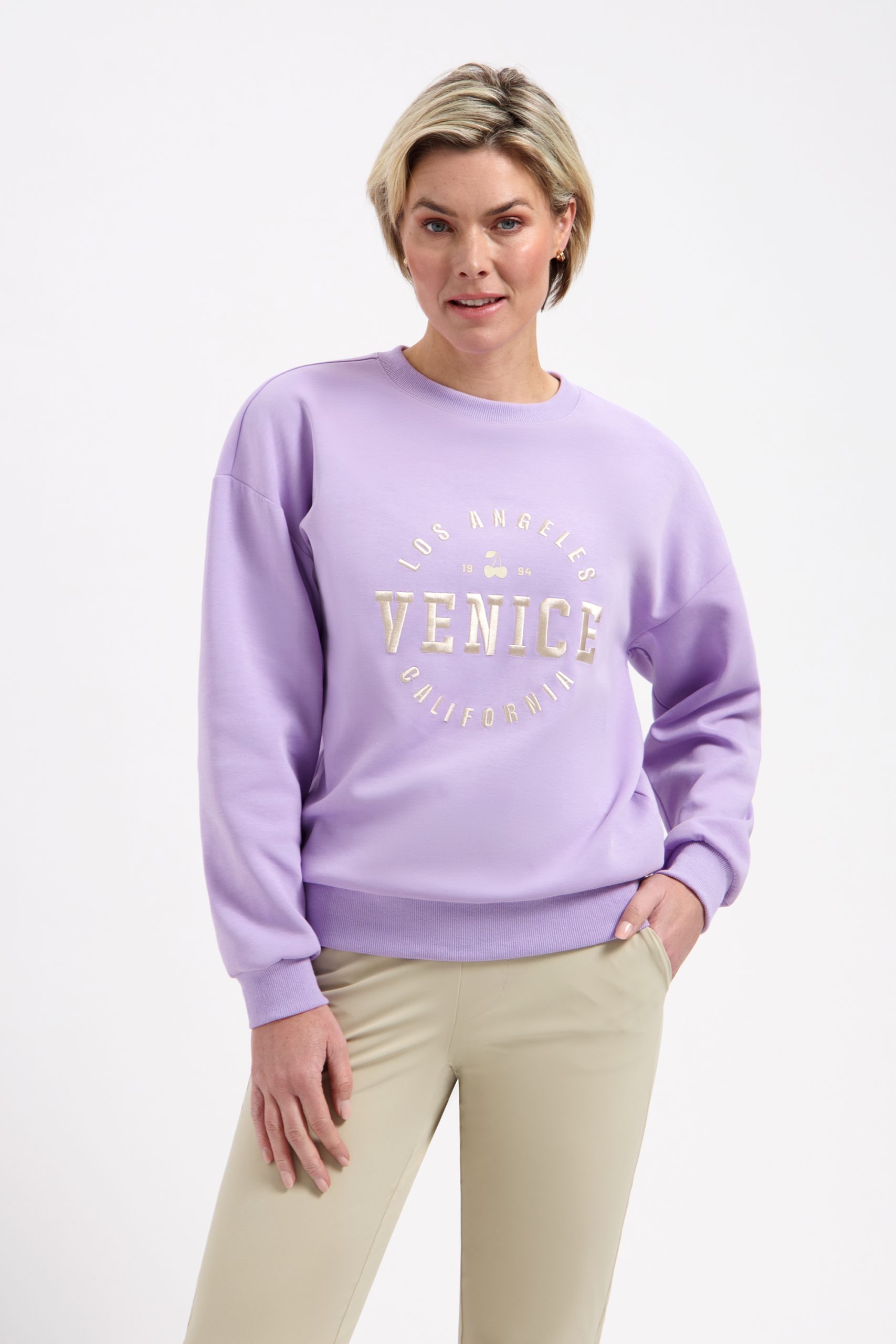 De zachte violet kleur geeft je outfit direct een frisse en eigentijdse uitstraling. De opvallende Venice print op de voorzijde zorgt voor een sportieve, moderne touch die perfect past bij een casual-chique look. Combineer de Venice Sweater moeiteloos met een travelstof broek van Lady Day voor een stijlvolle mix, of draag hem casual op een jeans. Dit is zo’n sweater die je pakt voor een dagje uit, een lunchafspraak of een relaxte werkdag, zonder na te denken.