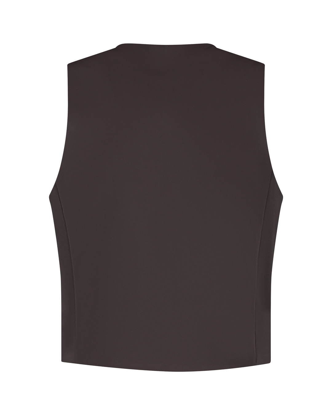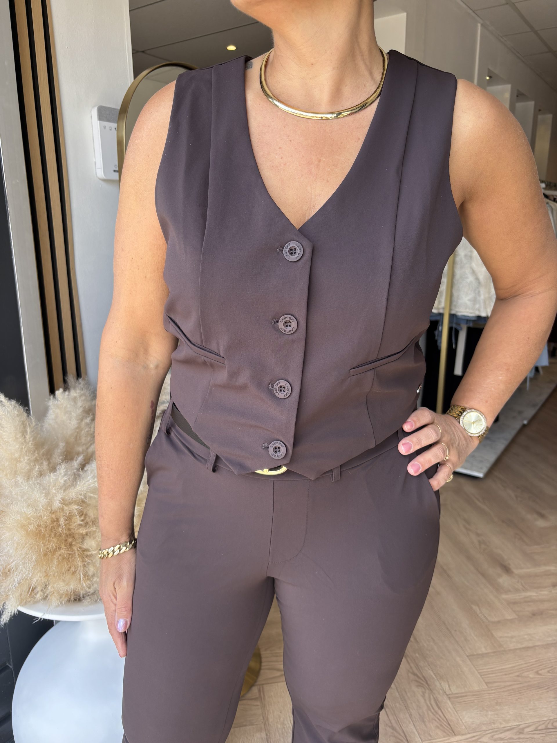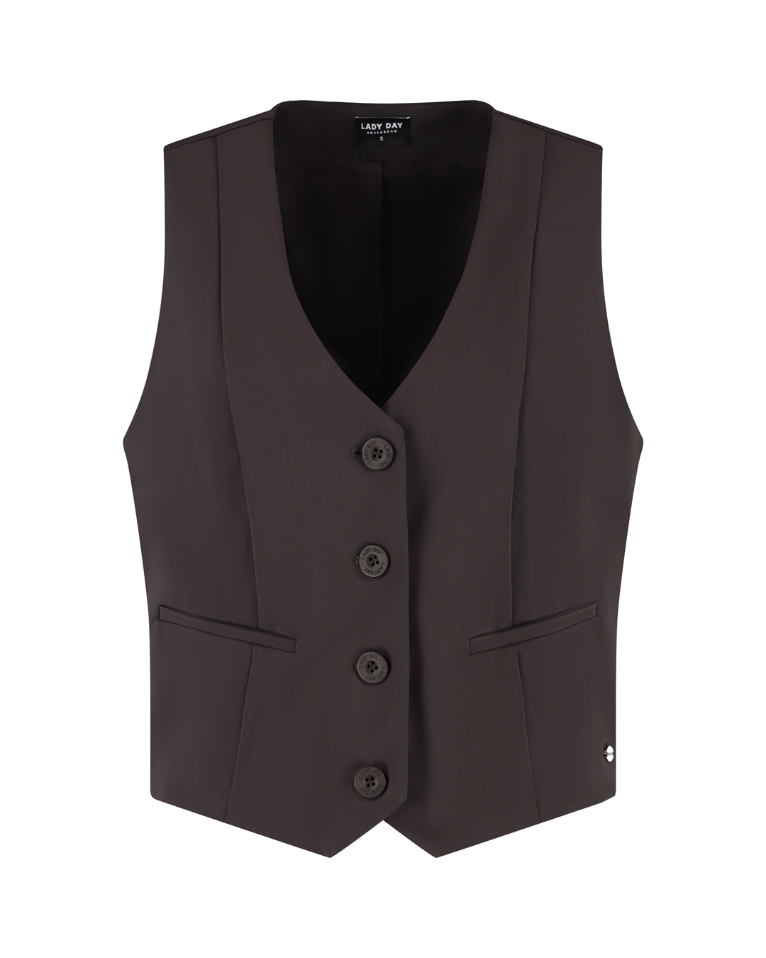 Geef je outfit een stijlvolle en krachtige uitstraling met deze Lady Day gilet in een diepe bruine tint. Dit elegante item uit de collectie van Lady Day is een veelzijdige toevoeging aan je garderobe en perfect voor zowel zakelijke als casual looks. Het klassieke ontwerp met knoopsluiting en subtiele details zorgt voor een tijdloze en vrouwelijke uitstraling.
