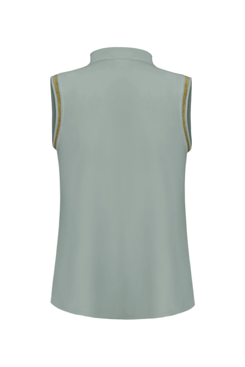 De mouwloze afwerking geeft de blouse een luchtige en eigentijdse uitstraling, terwijl de subtiele gouden bies zorgt voor een luxe en verfijnd detail. De zachte sage green kleur maakt deze blouse stijlvol en eenvoudig te combineren met verschillende outfits.