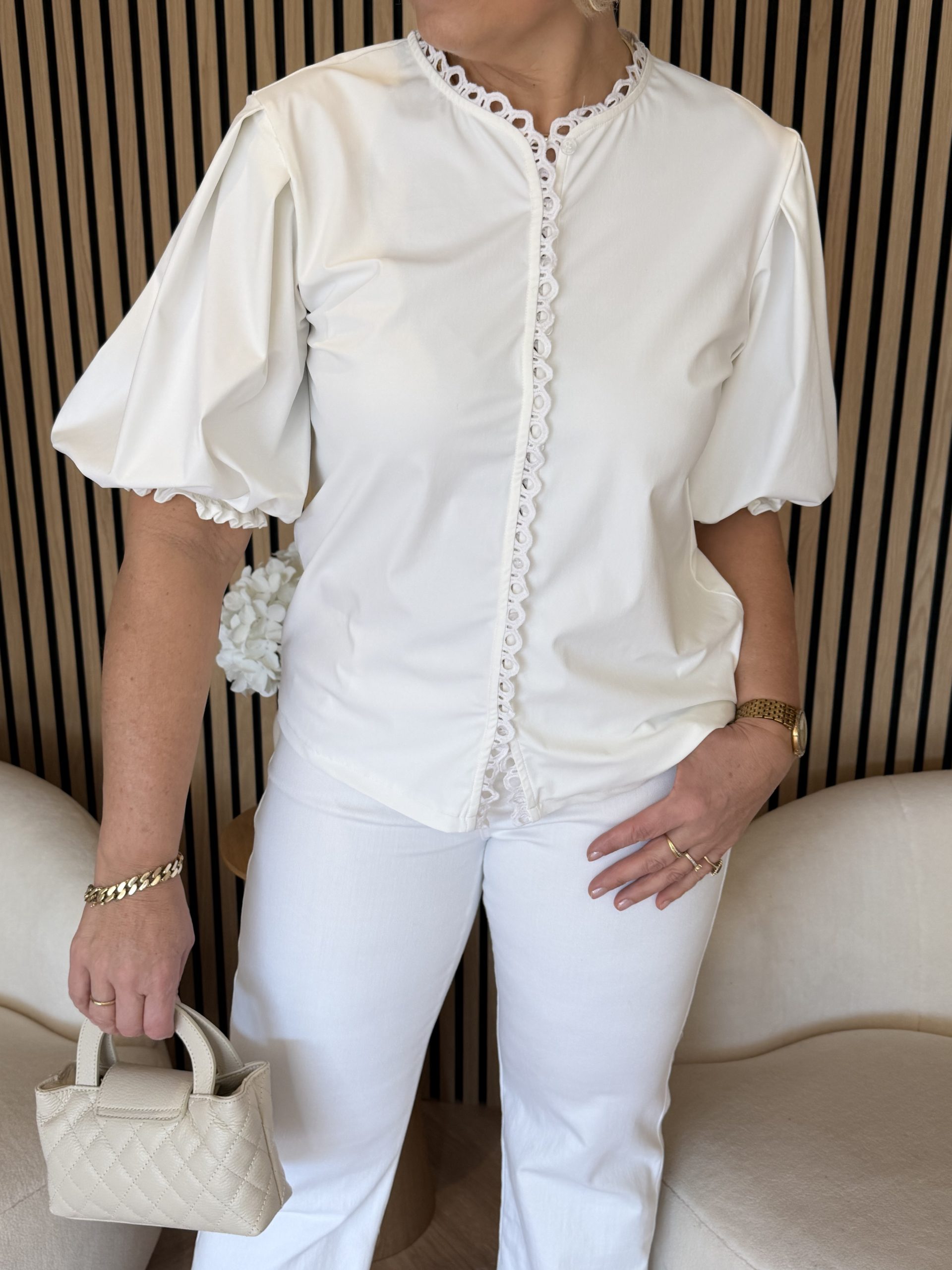Deze blouse heeft een verfijnde en vrouwelijke uitstraling dankzij de ronde kanten details langs de hals en knoopsluiting. De korte pofmouwen geven een speels en elegant effect, terwijl de witte kleur zorgt voor een frisse en tijdloze look die moeiteloos te combineren is.