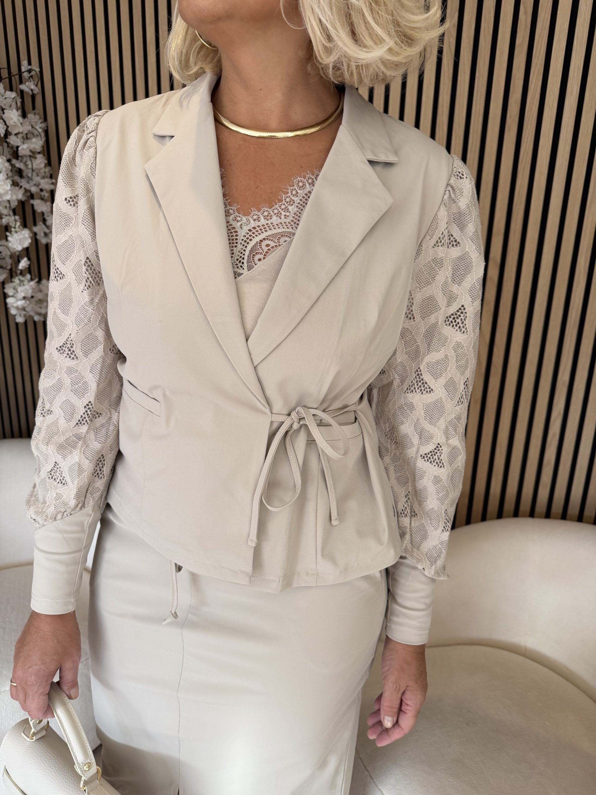 - De V-hals en de mouwuiteinden zijn afgewerkt met kant.